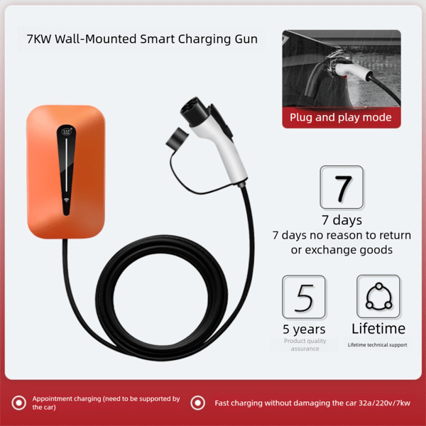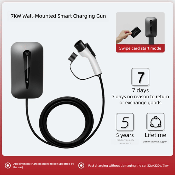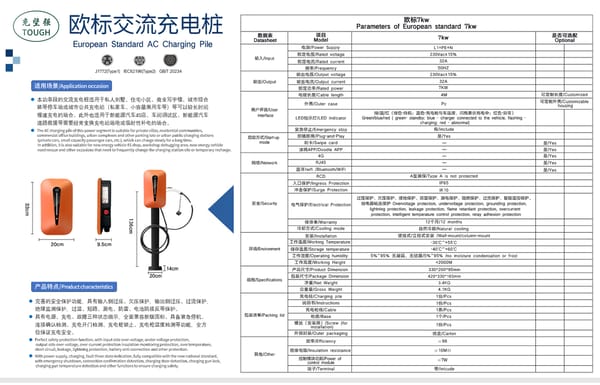 This European Standard AC Charging Pile, with a power of 7kw, is designed for diverse scenarios like private villas, residential areas, and commercial buildings. It operates on an L1+PE+N power supply, with rated voltage and current of 230Vac ±15% and 32A respectively, at 50Hz.